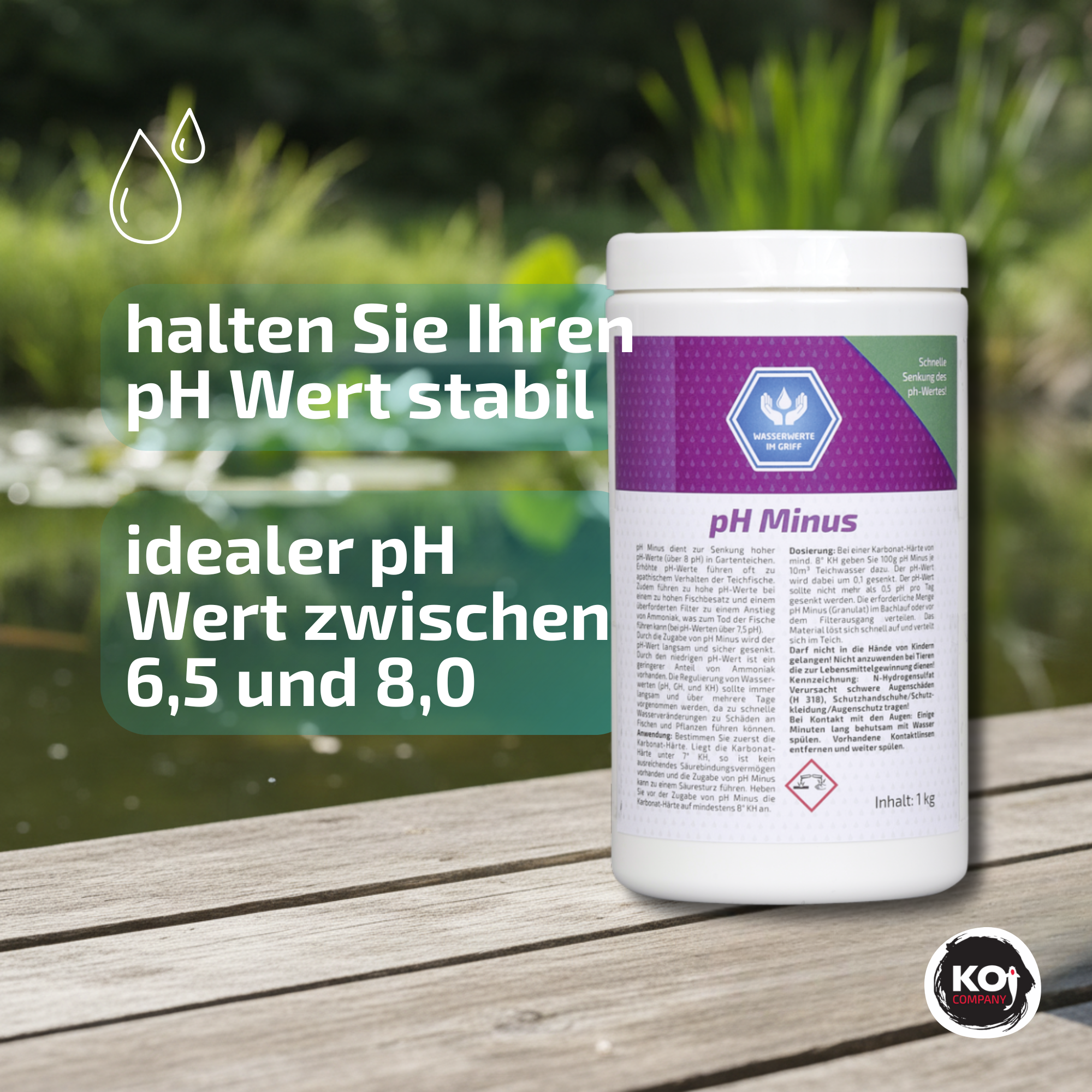 pH Minus wordt gebruikt om hoge pH-waarden (boven 8 pH) in tuinvijvers te verlagen. Door de lage pH-waarde is er minder ammoniak aanwezig.